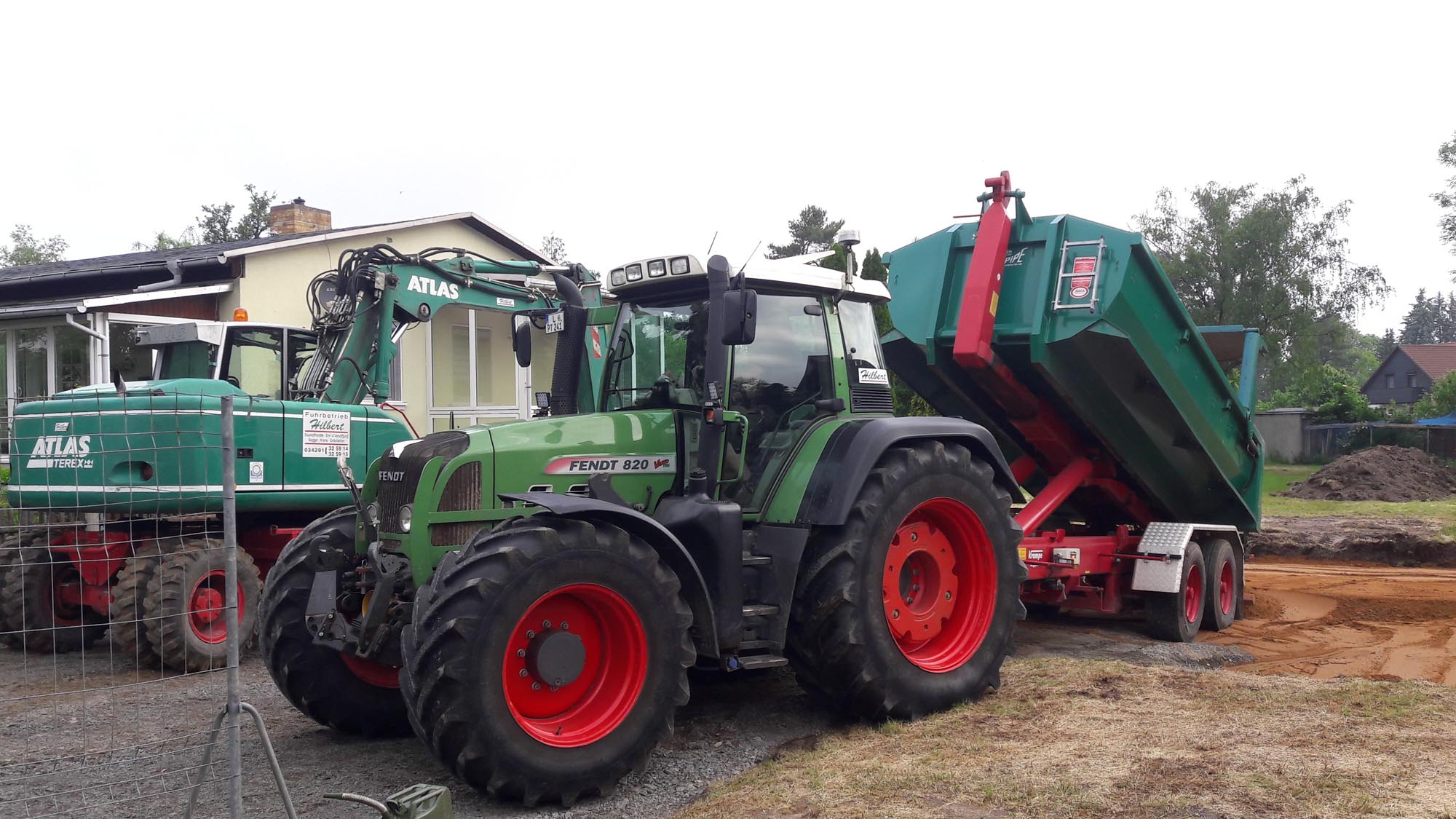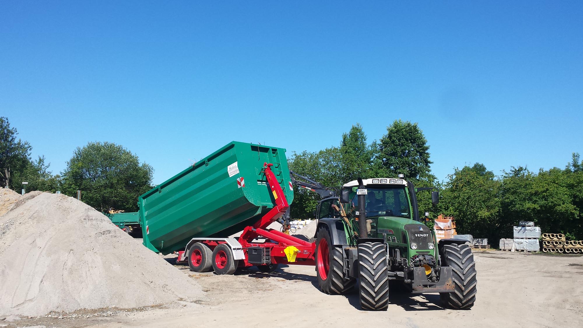 Im Außenbereich pachtet Firma Hilbert das Gelände der ehemaligen Schweinemastanlage und richtet es entsprechend her. Ein Zaun mit begrüntem Wall umringt die Lagerfläche für Baustoffe und Geräte.